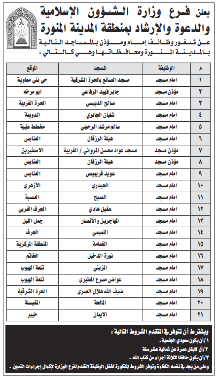 أعلنت وزارة الشؤون الإسلامية بالمدينة المنورة عبر جريدة المدينة المنورة طرح عدد 21 وظيفة شاغرة في مساجد المدينة المنورة ومحافظاتها، وذلك على النحو التالي :-