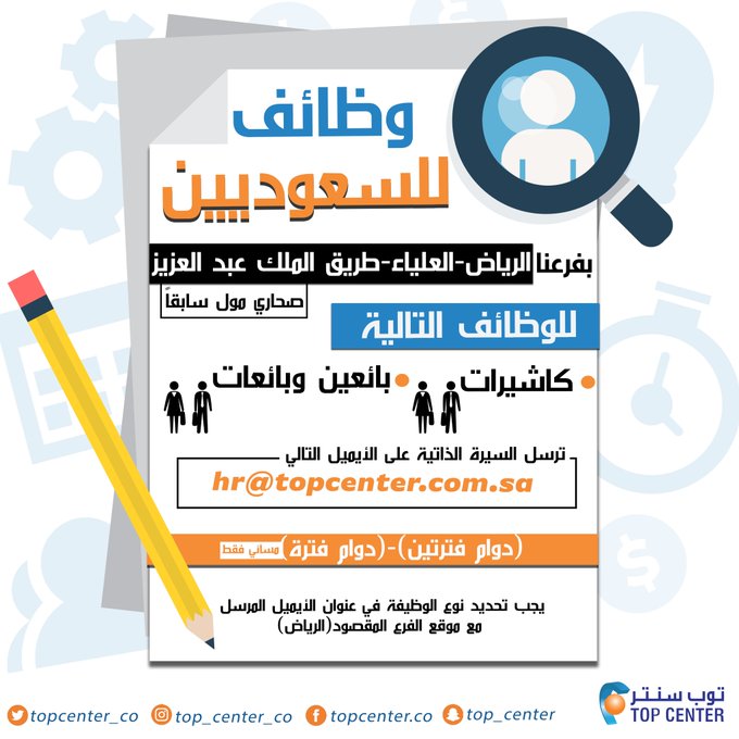 أعلن مركز توب سنتر عن طرح وظائف شاغرة في مدينة (الرياض) للرجال والنساء من حملة الثانوية فأعلى ، وذلك على النحو التالي :-